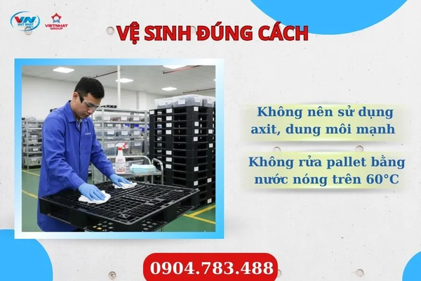 Pallet nhựa chống tĩnh điện cần được vệ sinh bằng khăn mềm cùng dung dịch trung tính. Doanh nghiệp không nên sử dụng axit, dung môi mạnh hoặc hóa chất ăn mòn vì có thể làm hỏng bề mặt pallet và ảnh hưởng đến khả năng ESD. Ngoài ra, không rửa pallet bằng nước nóng trên 60°C để tránh làm biến đổi tính chất nhựa.