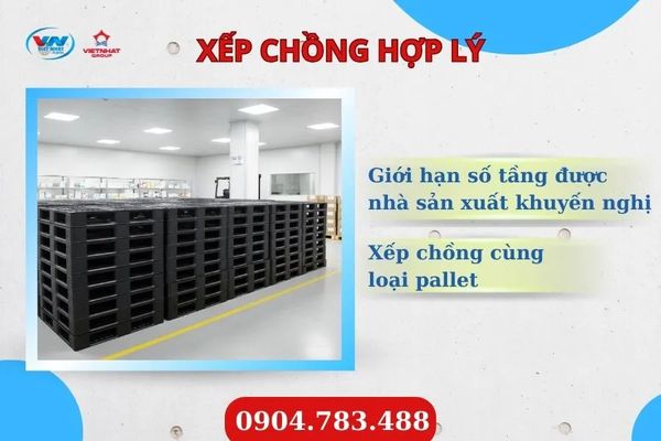 Mỗi loại pallet ESD đều có giới hạn số tầng được nhà sản xuất khuyến nghị. Không nên xếp vượt quá mức này để tránh sập đổ hàng hóa. Ngoài ra, chỉ nên xếp chồng cùng loại pallet để đảm bảo tính ổn định. Trong trường hợp cần xếp chồng cao, nên kết hợp với giá kệ hoặc khung chống đổ để tăng độ an toàn.