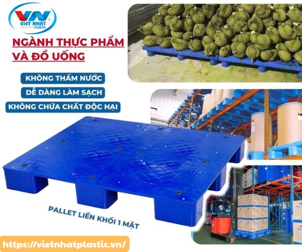 Pallet nhựa liền khối, bề mặt kín là sự lựa chọn lý tưởng cho ngành này. Các pallet nhựa trong công nghiệp này thường được làm từ nhựa HDPE. Là loại có khả năng chống thấm, chống ẩm tốt và chịu được môi trường khắc nghiệt trong kho lạnh. Kích thước phổ biến như 1100x1100mm hoặc 1200x1000mm giúp phù hợp với tiêu chuẩn của các xe nâng hoặc container vận chuyển.