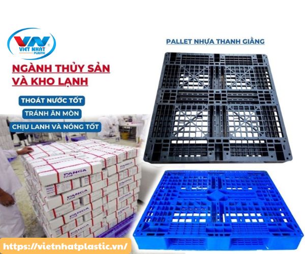 Ví dụ: pallet nhựa được dùng để lưu trữ hoặc vận chuyển cá, tôm, các loại thịt nhập khẩu. Các loại hải sản đông lạnh từ nhà máy đến các kho bảo quản hoặc điểm phân phối.