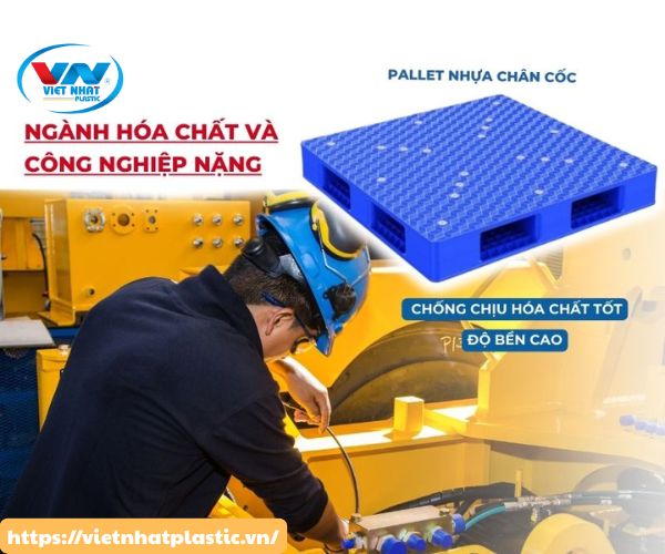 Ngành hóa chất với dung môi như các thùng hóa chất, dầu nhớt. Ngành công nghiệp năng, đòi hỏi pallet nhựa phải có khả năng chống chịu hóa chất mạnh như axit, kiềm. Đồng thời, pallet cần có tải trọng cao để lưu trữ và vận chuyển các kiện hàng nặng, cồng kềnh mà không gây biến dạng hoặc gãy vỡ.