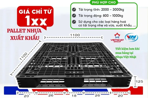 Hoàn toàn phù hợp. Pallet nhựa đen được sử dụng phổ biến trong xuất khẩu nhờ khả năng chống bẩn, khó trầy xước và giá thành sản xuất thấp. Loại pallet này đặc biệt thích hợp cho các chuyến xuất hàng “one-way” – không thu hồi.